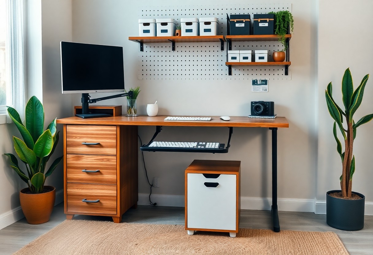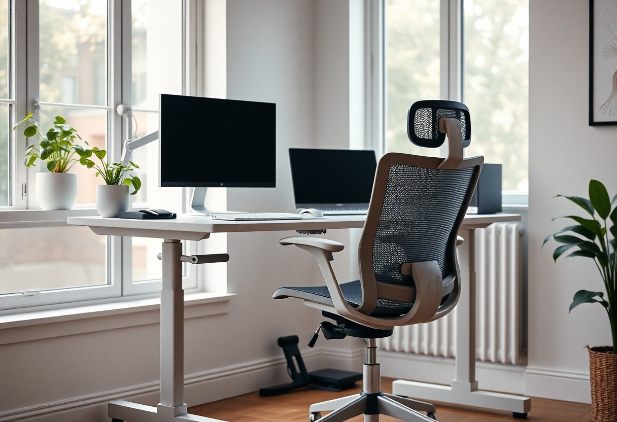 Wähle einen höhenverstellbaren Schreibtisch und einen ergonomischen Stuhl mit Lendenwirbelstütze; beide sollten sich an deine Körpermaße anpassen, um Haltungsschäden zu vermeiden.